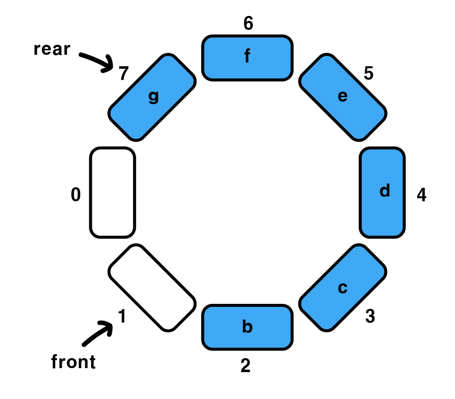 원형 큐는 앞서 선형 큐에서 deQueue 연산 등에 의해 front가 0보다 큰 경우에도(값이 빠져나간 부분의 메모리가 비어있음에도) rear가 마지막 인덱스와 동일하면 isFull이 true를 반환하는 문제를 보완하기 위한 자료구조이다. 원형 큐가 가지는 특성은 아래와 같다.