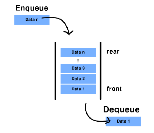 선형 큐 개념도 큐는 FIFO(first-in-first-out), 즉, 선입선출 원칙을 따르는 선형 자료구조이다. 따라서 큐는 특정한 순서를 따라 처리해야 하는 데이터를 저장할 때 주로 사용된다. 큐는 스택과 달리 삽입과 삭제가 양방향에서 이루어지며, 입력을 Enqueue 출력을 Dequeue라 한다. 이때 삽입이 이루어지는 부분(가장 뒷 부분)을 rear 삭제가 이루어지는 부분(가장 앞 부분)을 front라 한다. 스택과 유사하게 rear, front 부분에만 접근 가능하며, 큐에서 사용되는 주요 연산은 앞서 언급한 Enqueue, Dequeue 외에도 peek, isEmpty, size 등이 있다. (deQueue 실행시 front는 front + 1로 변경되고 enQueue 증가시 rear는 rear + 1로 변경 된다. )