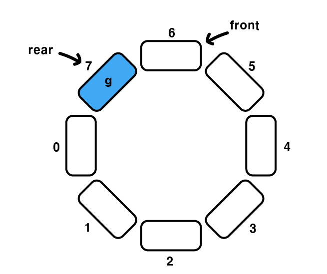 큐의 포화상태 여부 확인 후 포화상태가 아닐 시, rear를 (rear + 1) % queueSize로 이동 후 해당 위치에 데이터 삽입. 이는 데이터 g 삽입 까지 동일하게 작동하며 g 삽입 이후에 추가적인 enQueue는 deQueue 연산이 선행되지 않은 경우 불가능하다.