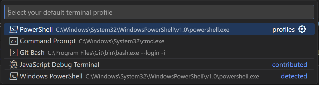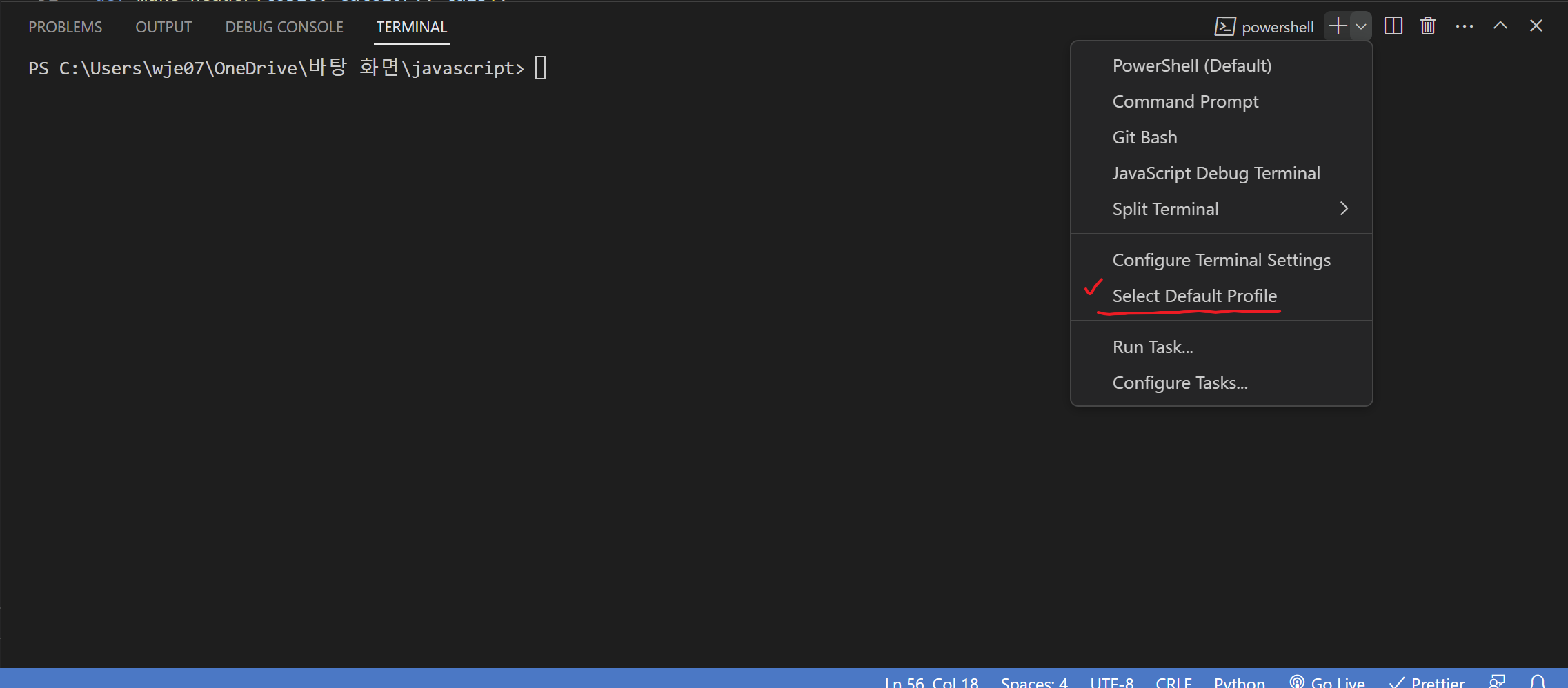 위 에러 메세지는 vs code의 기본 터미널이 cmd 혹은 git bash가 아니기 때문에 발생하는 오류에 대한 메세지 입니다. 따라서 간단하게 터미널 종류를 바꾸는 것으로 해결할 수 있습니다. 터미널 종류를 바꾸는 방법은 아래와 같습니다.
