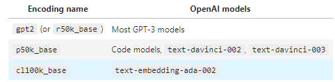 tiktoken 모듈은 OpenAI 모델에서 사용되기 위해 제작된 BPE 토크나이저입니다. tiktoken.get_encoding("encoding name")을 통해 토크나이저를 로드합니다. 이후 .encode() 함수를 통해 텍스트를 토큰으로, 혹은 그 반대로 변환합니다. 아래 표는 각 모델에 대응하는 encoding name을 나타냅니다.