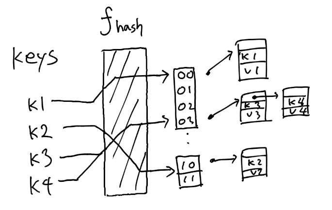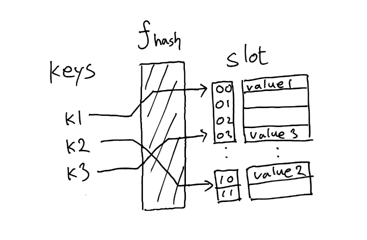 value가 저장되는 곳을 버킷 혹은 슬롯이라 합니다. 키와 대응되는 슬롯의 크기가 동일한 경우 direct address table 라고 하며, 이 경우 실제 사용하지 않는 키가 많아 메모리 낭비가 심해지는 문제가 있습니다. 그렇기에 일반적으로 슬롯의 크기를 실제 사용하는 key의 개수보다 적게하며 이를 hash table이라 합니다.