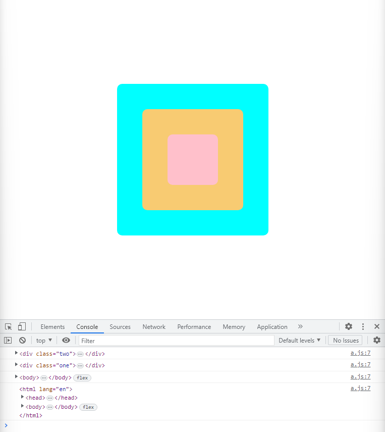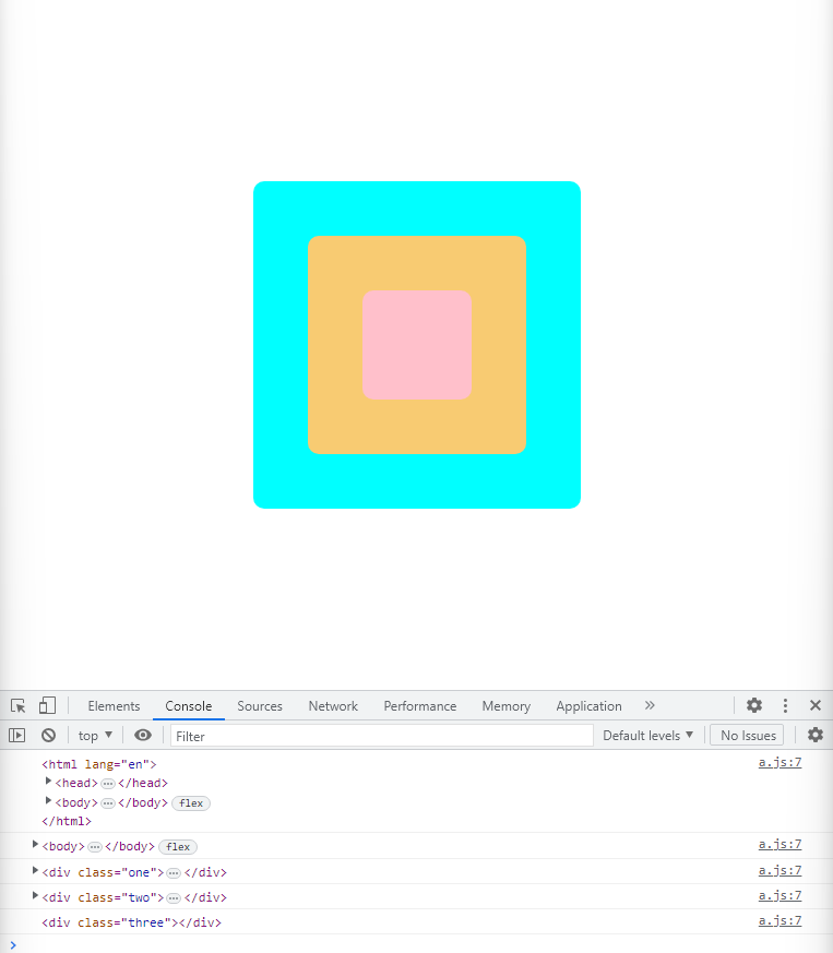 <body> <div class="one"> <div class="two"> <div class="three"> </div> </div> </div> </body>var divs = document.querySelectorAll("div"); divs.forEach((div) => { div.addEventListener("click", logEvent); }); function logEvent(event) { console.log(event.currentTarget); }위는 핑크색 영역을 선택한 결과입니다. 콘솔의 로그를 확인하면 알 수 있듯이 이벤트는 div.three에서부터 html element까지 차례대로 dom 트리를 올라가며 발생합니다.(document.querySelectorAll을 사용했으므로 document, window 객체에는 이벤트가 추가되지 않았으며 따라서 콘솔창에 출력되지 않았습니다.)