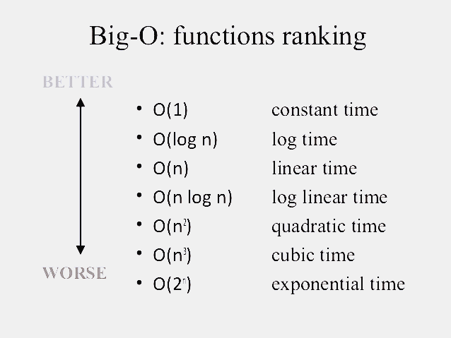big O notation : 빅-오 표기법에서는 복잡도는 입력 (n)에 따라 평가되며, 일반적으로 문제를 해결하는 데 필요한 최대치의 작업 혹은 단계의 수로 표현된다.