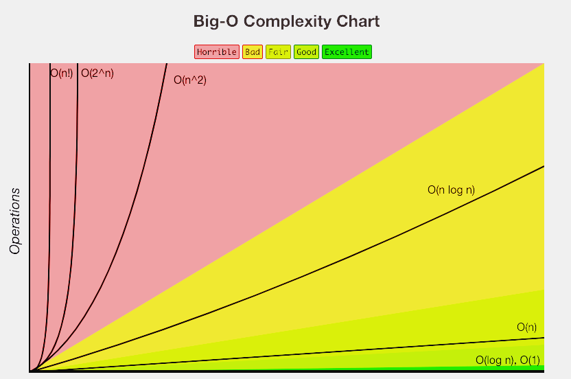 - O(2^n) / O(n!) : 기하급수적 복잡도. 입력의 크기에 따라 실행에 필요한 시간이 기하급수적으로 증가